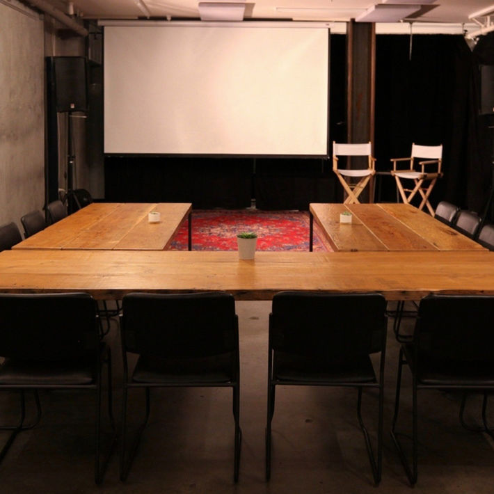 The Capp St. Gallery is on the Lower Level, featuring concrete walls and wooden farm tables. Ideal for meetings, or as an addition to the Theater Gallery.